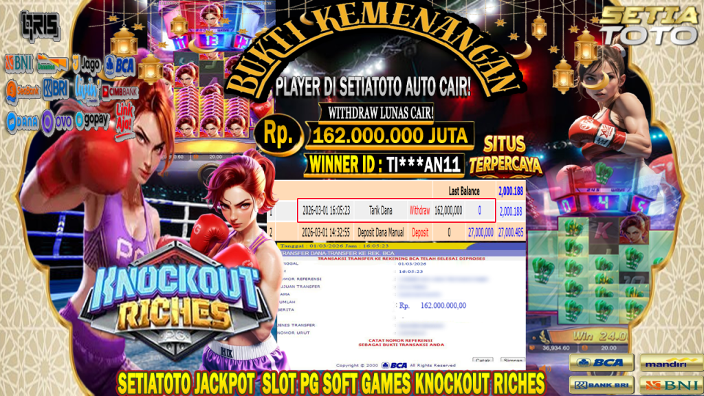 BUKTI KEMENANGAN 01 MARET 2026 DI GAME Knockout Riches WD 162,000,000 JUTA