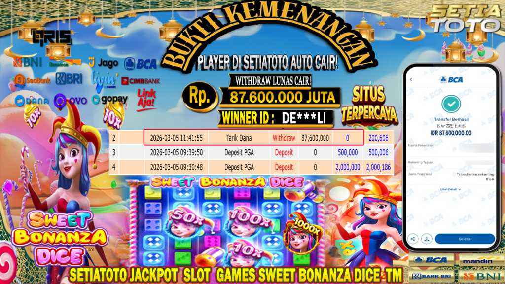 Bandar togel SETIATOTO merupakan bandar togel dan slot online yang membayar semua kemenangan member hingga lunas. Setiap pembayaran pada situs kami dilakukan dengan cara transfer ke rekening tujuan yang sudah di daftarkan pada situs togel online kami, Pembayaran hanya dapat di proses jika rekening yang di daftarkan telah valid dan dapat di transfer. Semua kemenangan member yang mendapatkan hadiah jackpot terbesar akan kami posting agar semua pemain dapat melihat bandar situs terpercaya SETIATOTO ini membayar semua kemenangan member hingga lunas. Setiap postingan yang kami posting akan kami lakukan sensor pada nomor rekening 4 digit dan nama rekening untuk menjaga privasi dan kerahasiaan member. Postingan Jackpot yang kami posting agar member atau pemain yang belum pernah bermain bisa melihat bandar togel Bukan Kaleng Kaleng Seperti SETIATOTO ini, Semua postingan jackpot yang kami posting dapat di lihat data keasliannya melalui nomor reff yang di tunjukan pada bank atau mbanking saat kita melakukan transfer