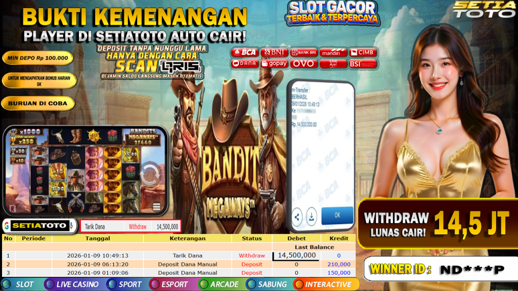 BUKTI KEMENANGAN 09 JANUARI 2026 DI GAME Bandit Megaways™ WD 14,5 JUTA