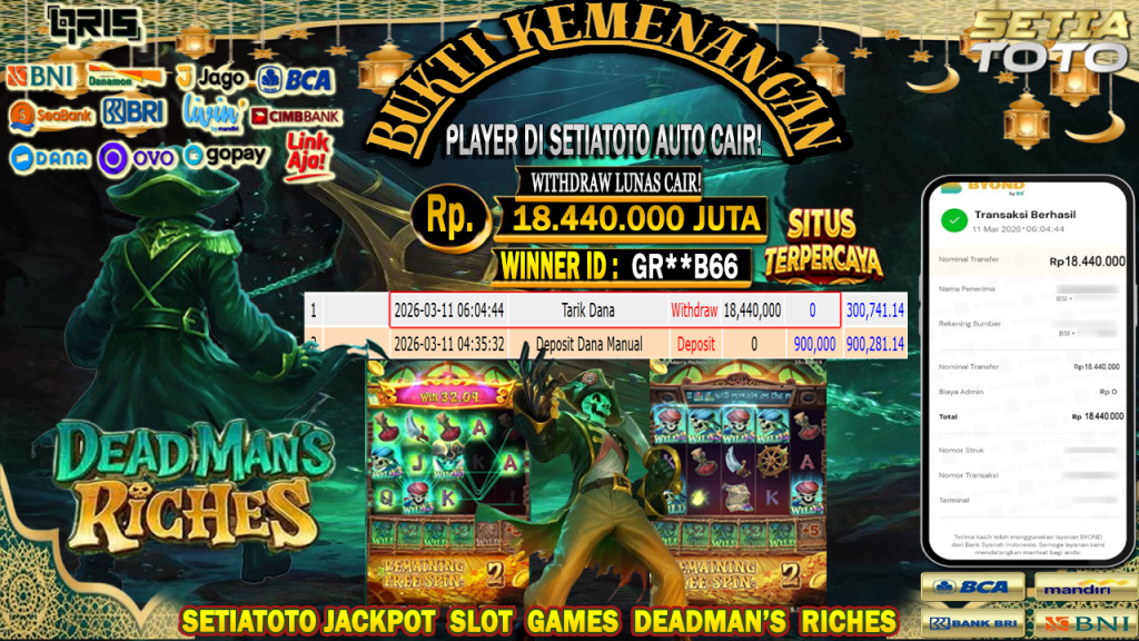 BUKTI KEMENANGAN 11 MARET 2026 DI GAME Dead Man’s Riches WD 18,440,000 JUTA