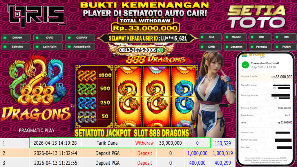 BUKTI KEMENANGAN 13 APRIL 2026 DI GAME 888 Dragons WD 33,000,000 JUTA