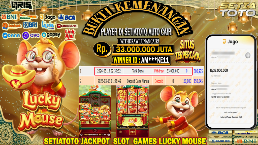 BUKTI KEMENANGAN 13 MARET 2026 DI GAME Lucky Mouse WD 33,000,000 JUTA