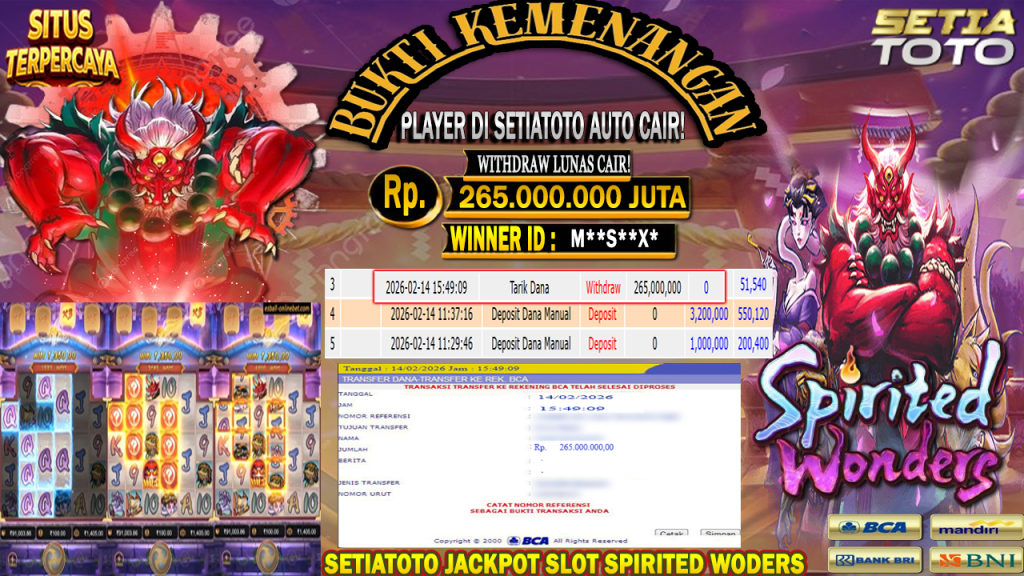 BUKTI KEMENANGAN 14 FEBRUARI 2026 DI GAME Spirited Wonder WD 265,000,000 JUTA