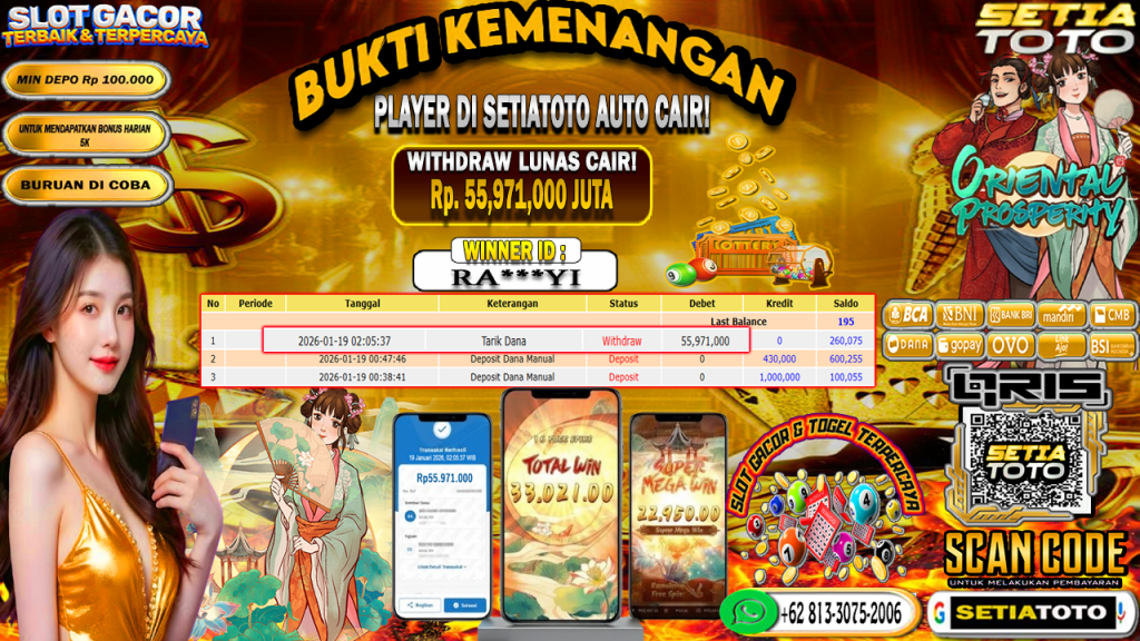 BUKTI KEMENANGAN 19 JANUARI 2026 DI GAME Oriental Prosperity WD 55,971,000 JUTA