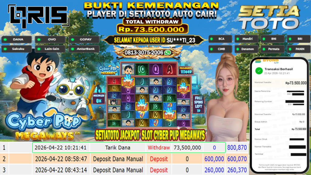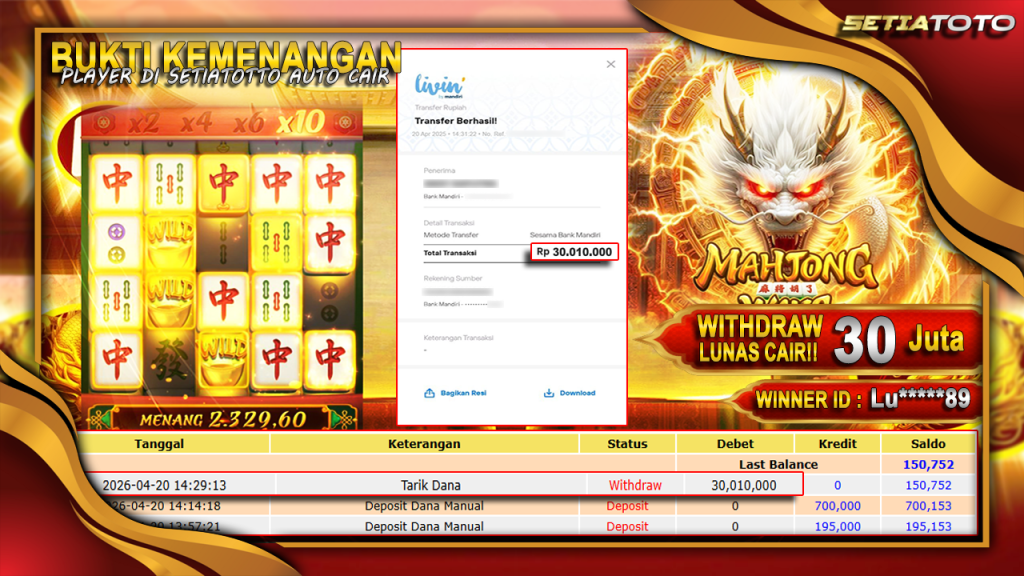 Bandar togel SETIATOTO merupakan bandar togel dan slot online yang membayar semua kemenangan member hingga lunas. Setiap pembayaran pada situs kami dilakukan dengan cara transfer ke rekening tujuan yang sudah di daftarkan pada situs togel online kami, Pembayaran hanya dapat di proses jika rekening yang di daftarkan telah valid dan dapat di transfer. Semua kemenangan member yang mendapatkan hadiah jackpot terbesar akan kami posting agar semua pemain dapat melihat bandar situs terpercaya SETIATOTO ini membayar semua kemenangan member hingga lunas. Setiap postingan yang kami posting akan kami lakukan sensor pada nomor rekening 4 digit dan nama rekening untuk menjaga privasi dan kerahasiaan member. Postingan Jackpot yang kami posting agar member atau pemain yang belum pernah bermain bisa melihat bandar togel Bukan Kaleng Kaleng Seperti SETIATOTO ini, Semua postingan jackpot yang kami posting dapat di lihat data keasliannya melalui nomor reff yang di tunjukan pada bank atau mbanking saat kita melakukan transfer.