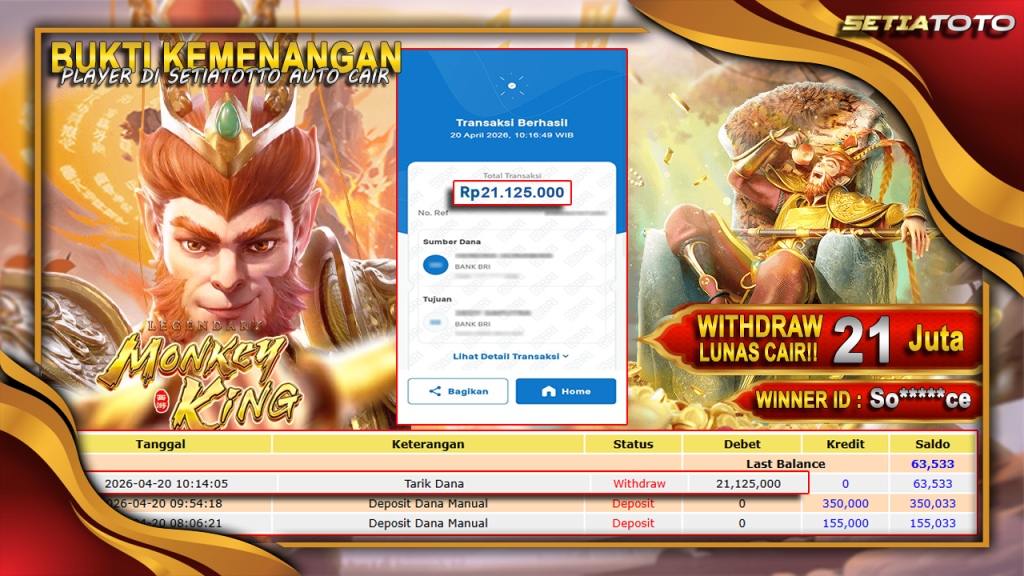 BUKTI KEMENANGAN 20 APRIL 2026 DI GAME LEGENDARY MONKEY KING WD 21,125,000 JUTA