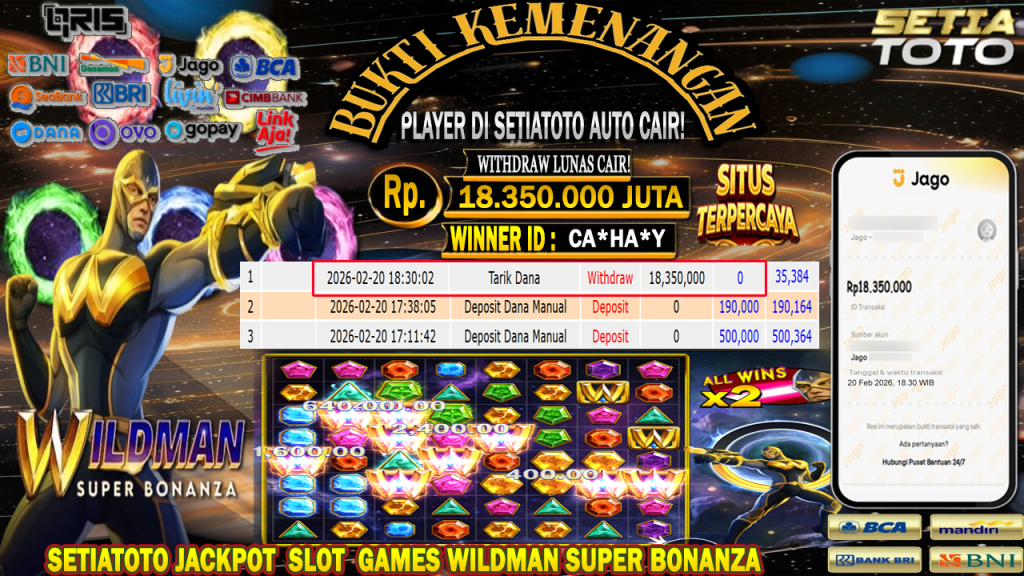 BUKTI KEMENANGAN 20 FEBRUARI 2026 DI GAME Wildman Super Bonanza WD 18,350,000 JUTA