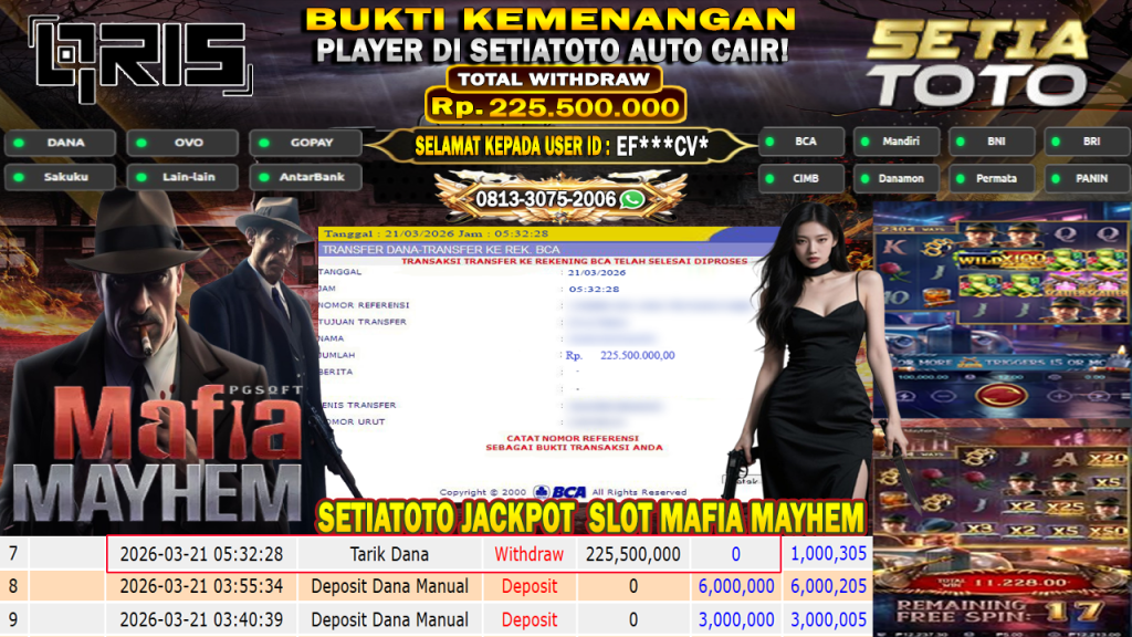 Bandar togel SETIATOTO merupakan bandar togel dan slot online yang membayar semua kemenangan member hingga lunas. Setiap pembayaran pada situs kami dilakukan dengan cara transfer ke rekening tujuan yang sudah di daftarkan pada situs togel online kami, Pembayaran hanya dapat di proses jika rekening yang di daftarkan telah valid dan dapat di transfer. Semua kemenangan member yang mendapatkan hadiah jackpot terbesar akan kami posting agar semua pemain dapat melihat bandar situs terpercaya SETIATOTO ini membayar semua kemenangan member hingga lunas. Setiap postingan yang kami posting akan kami lakukan sensor pada nomor rekening 4 digit dan nama rekening untuk menjaga privasi dan kerahasiaan member. Postingan Jackpot yang kami posting agar member atau pemain yang belum pernah bermain bisa melihat bandar togel Bukan Kaleng Kaleng Seperti SETIATOTO ini, Semua postingan jackpot yang kami posting dapat di lihat data keasliannya melalui nomor reff yang di tunjukan pada bank atau mbanking saat kita melakukan transfer.