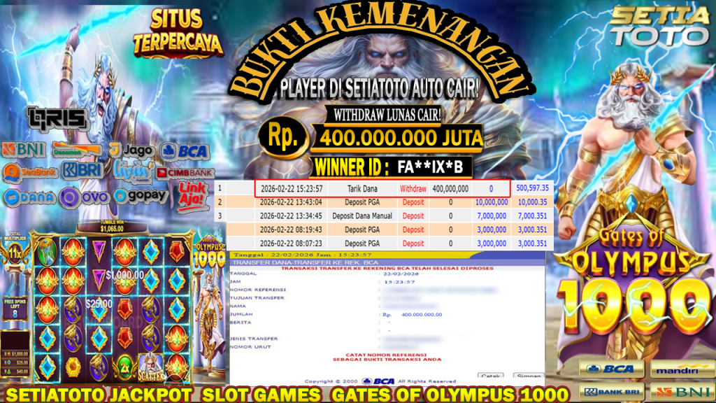 BUKTI KEMENANGAN 22 FEBRUARI 2026 DI GAME Gates Of Olympus 1000 WD 400,000,000 JUTA