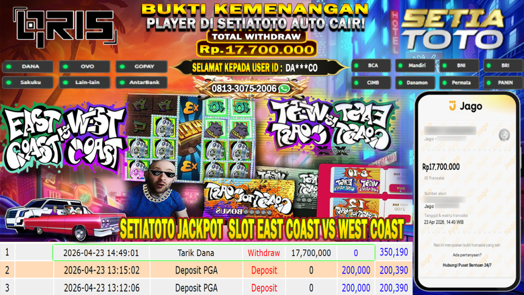 BUKTI KEMENANGAN 23 APRIL 2026 DI GAME (No Limit City) Gem East Coast vs West Coast WD 17,700,000 JUTA