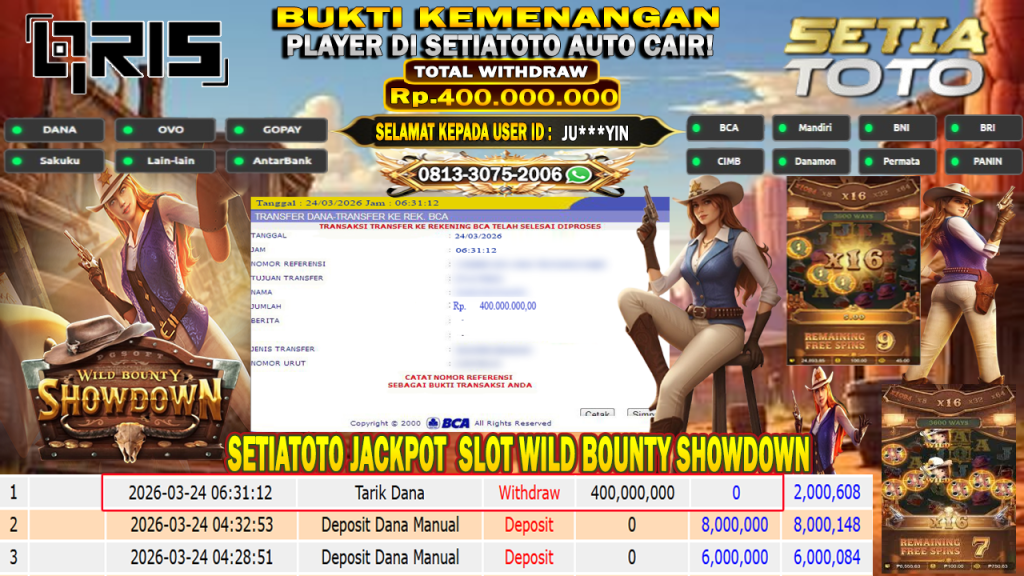 Bandar togel SETIATOTO merupakan bandar togel dan slot online yang membayar semua kemenangan member hingga lunas. Setiap pembayaran pada situs kami dilakukan dengan cara transfer ke rekening tujuan yang sudah di daftarkan pada situs togel online kami, Pembayaran hanya dapat di proses jika rekening yang di daftarkan telah valid dan dapat di transfer. Semua kemenangan member yang mendapatkan hadiah jackpot terbesar akan kami posting agar semua pemain dapat melihat bandar situs terpercaya SETIATOTO ini membayar semua kemenangan member hingga lunas. Setiap postingan yang kami posting akan kami lakukan sensor pada nomor rekening 4 digit dan nama rekening untuk menjaga privasi dan kerahasiaan member. Postingan Jackpot yang kami posting agar member atau pemain yang belum pernah bermain bisa melihat bandar togel Bukan Kaleng Kaleng Seperti SETIATOTO ini, Semua postingan jackpot yang kami posting dapat di lihat data keasliannya melalui nomor reff yang di tunjukan pada bank atau mbanking saat kita melakukan transfer.
