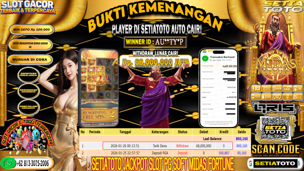 BUKTI KEMENANGAN 26 JANUARI 2026 DI GAME Midas Fortune WD 68,000,000 JUTA