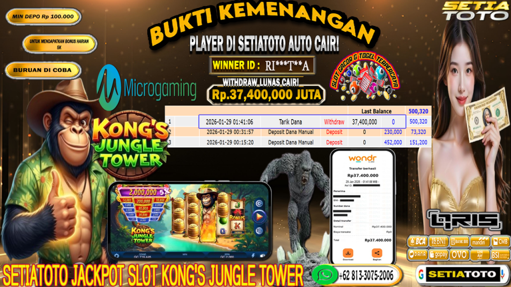 BUKTI KEMENANGAN 29 JANUARI 2026 DI GAME Kong’s Jungle Tower WD 37,400,000 JUTA