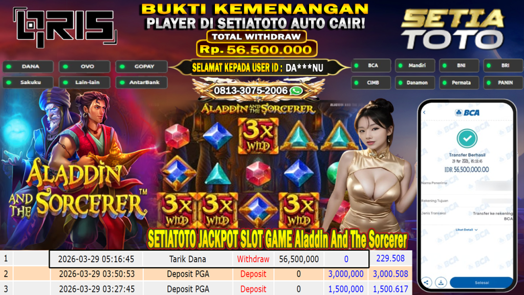 BUKTI KEMENANGAN 29 MARET 2026 DI GAME Aladdin And The Sorcerer WD 56,500,000 JUTA